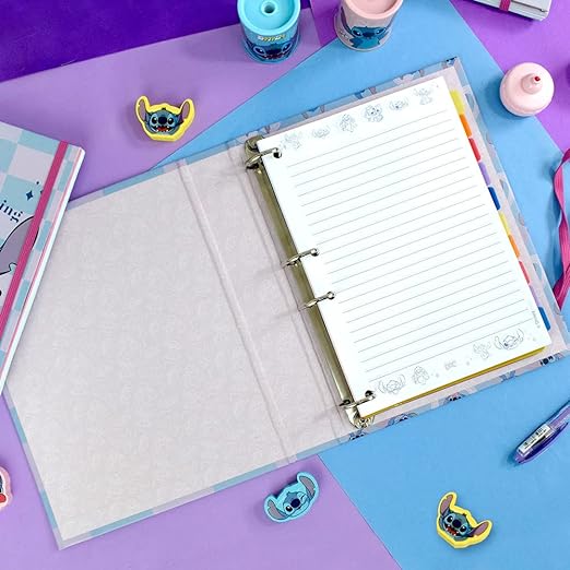 O fichário do nosso pequeno e amado Stitch é estiloso demais. Ele é o item perfeito para alegrar as atividades, ideal para estimular a organização dos estudos diários e alcançar as metas e objetivos sem perder a motivação. Cheio de versatilidade ao inserir ou retirar folhas, pois as argolas articuladas abrem, possibilitando esta ação. Útil e estiloso, foi feito para arrasar! Pronto para escola ou faculdade.